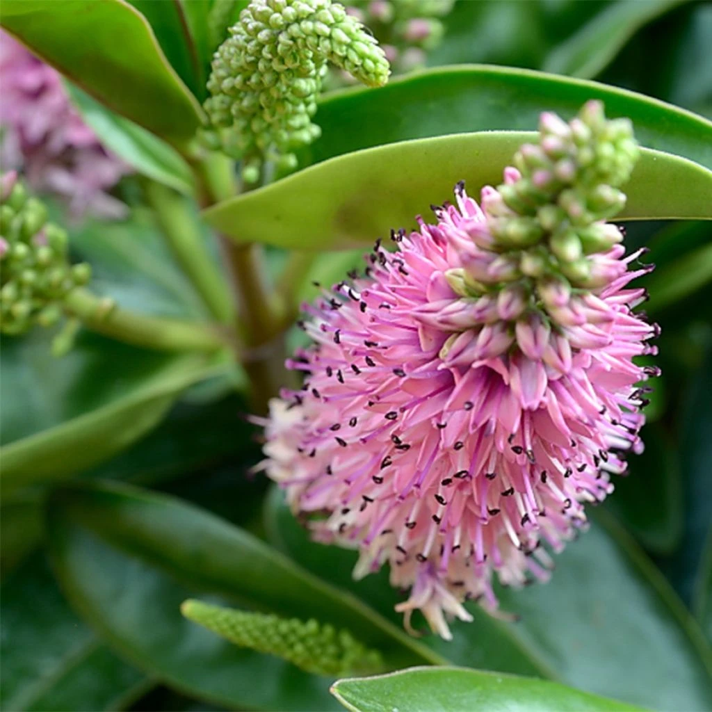 Les Hebe de la série « Wiri » ont été sélectionnées au sein du Auckland Regional Botanic Gardens pour leur bonne résistance aux maladies du feuillage, sévissant souvent en climat humide et leur assez bonne résistance au froid de l’ordre de -10°C. Mais en climat frais, optez pour une valeur sûre comme la grande Hebe Midsummer Beauty, qui forme un bel arbuste jusqu’à 1,20 m, livrant des fleurs bleu-lavande durant tout l’été et qui mérite une place dans la plupart des jardins. est une nouvelle variété irlandaise tout aussi robuste et adaptée à la culture en pot en raison de sa forme compacte de 50 cm et sa tolérance à -12°C. Son feuillage vert foncé pourpré disparaît tout l’été sous une profusion d’épis de 5 cm, rose framboise lavé de blanc.