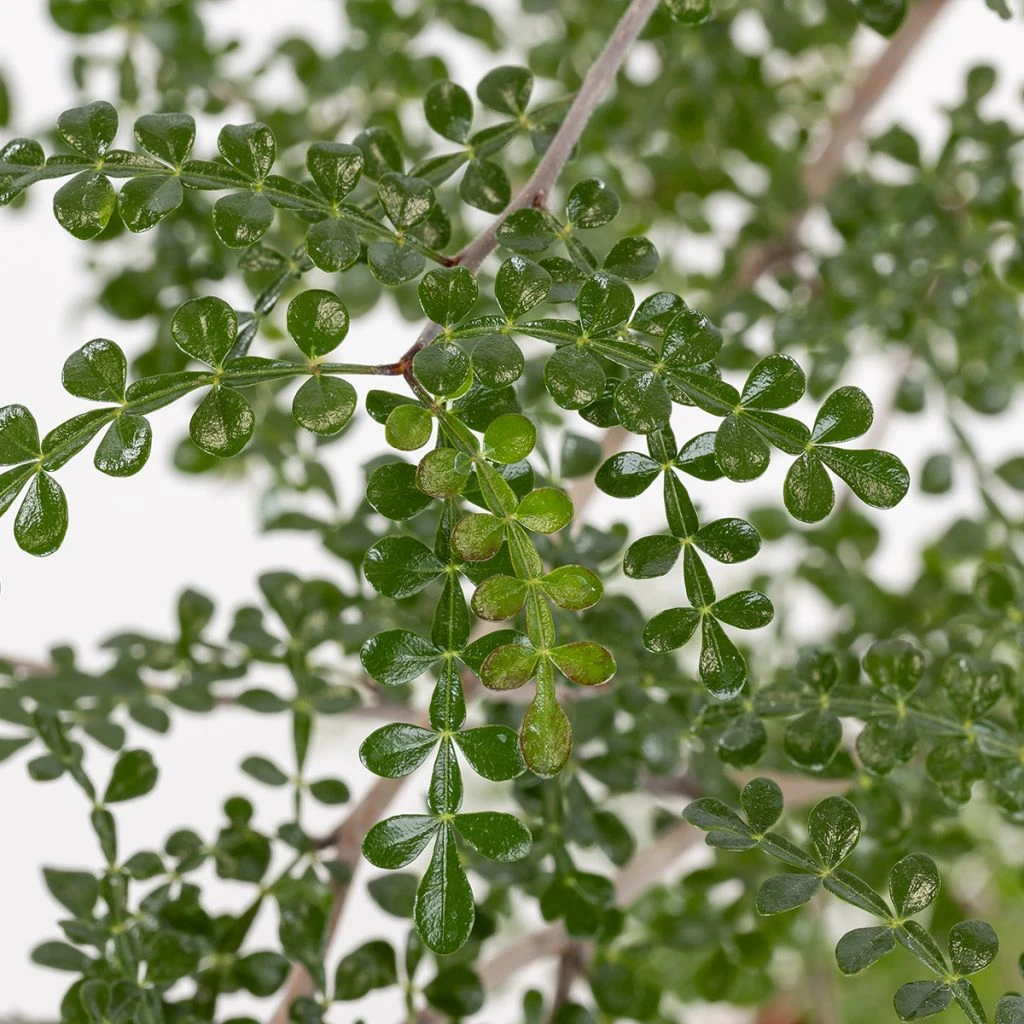 Il émet de courts rameaux, qui poussent en zigzag, avec une couronne tantôt conique, tantôt plus étalée, de façon assez irrégulière et non symétrique. Les feuilles sont composées, imparipennées, formées habituellement de 5 ou 7 paires de folioles latérales et d’une foliole terminale. Ne mesurant que 3 à 6 cm de long, ces feuilles de couleur vert foncé sont brillantes et d’un vert plus clair à la face inférieure. Leur faible surface ainsi que la cuticule protectrice qui leur donne cet aspect luisant sont comme le caudex des adaptations à la sécheresse. La transpiration de la plante est ainsi réduite au minimum.